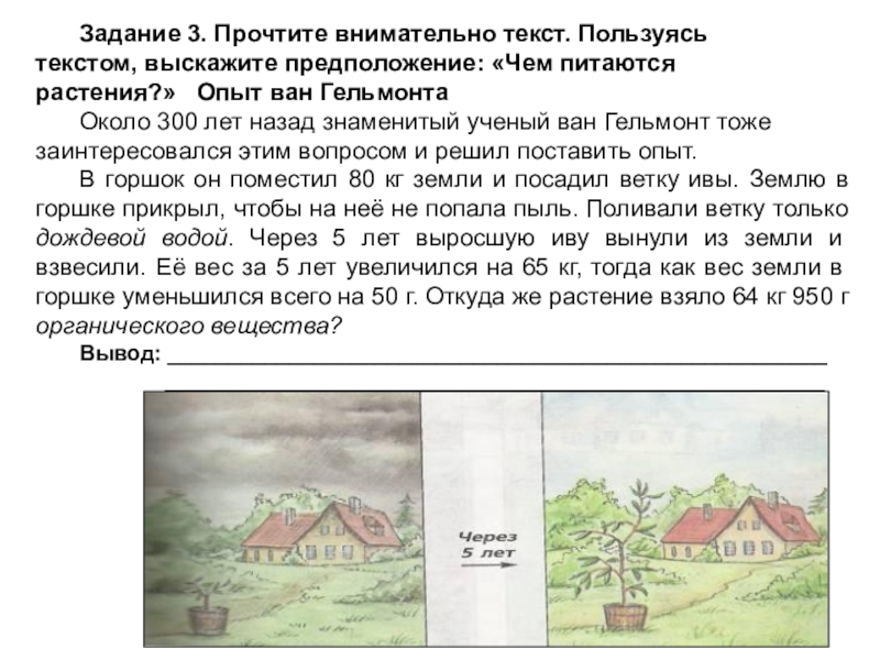 В горшок он поместил 80 кг земли и посадил ветку ивы. Землю в горшке прикрыл, чтобы на неё не попала пыль. Поливали ветку только дождевой водой. Через 5 лет выросшую иву вынули из земли и взвесили. Её вес за 5 лет увеличился на 65 кг, тогда как вес земли в горшке уменьшился всего на 50 г. Откуда же растение взяло 64 кг 950 г органического вещества?