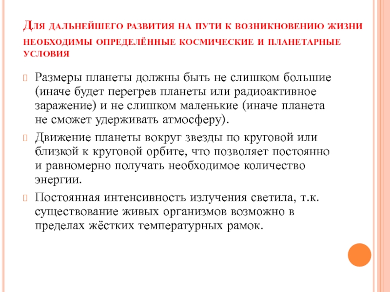 Размеры планеты должны быть не слишком большие (иначе будет перегрев планеты или радиоактивное заражение) и не слишком маленькие (иначе планета не сможет удерживать атмосферу).