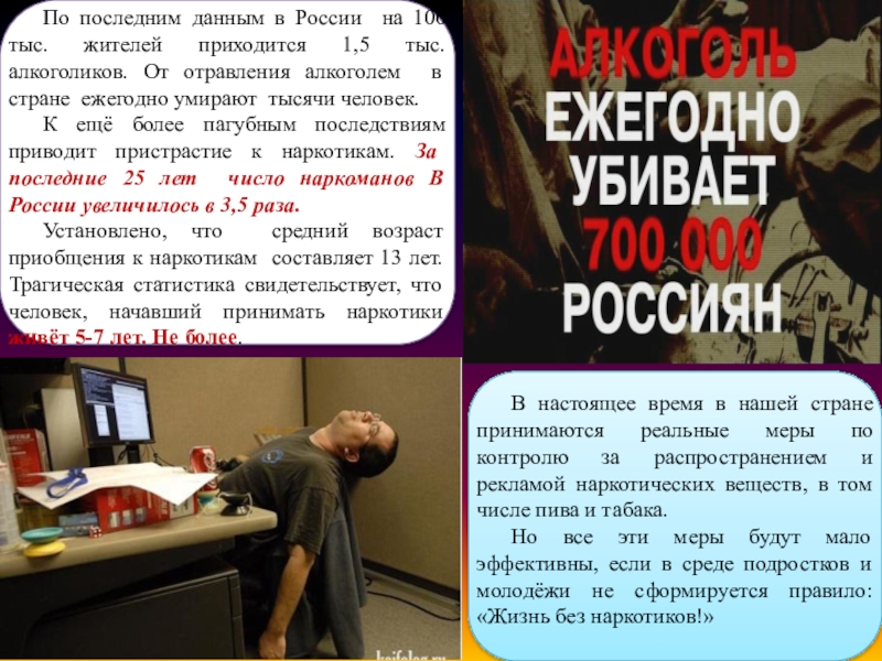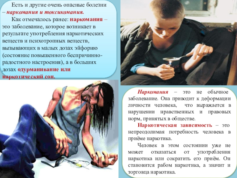 Наркомания – это не обычное заболевание. Она приводит к деформации личности человека, что выражается в нарушении нравственных и правовых норм, принятых в обществе.