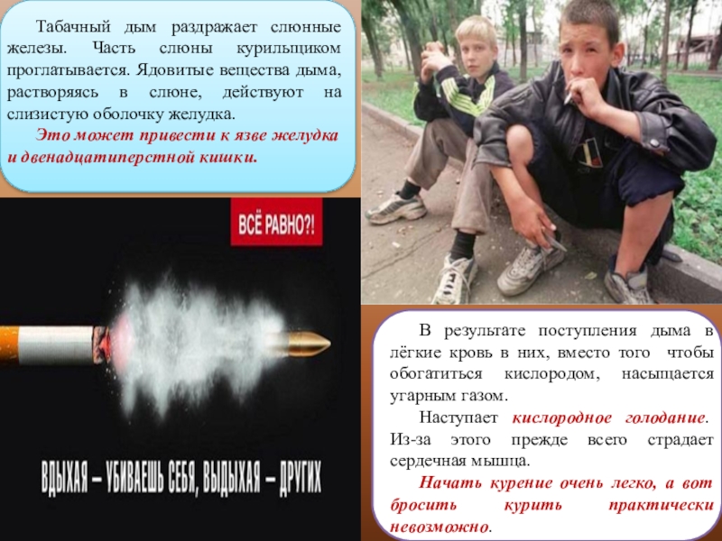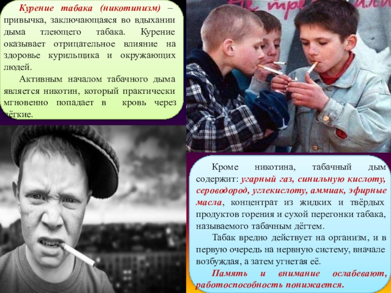 Табак вредно действует на организм, и в первую очередь на нервную систему, вначале возбуждая, а затем угнетая её.