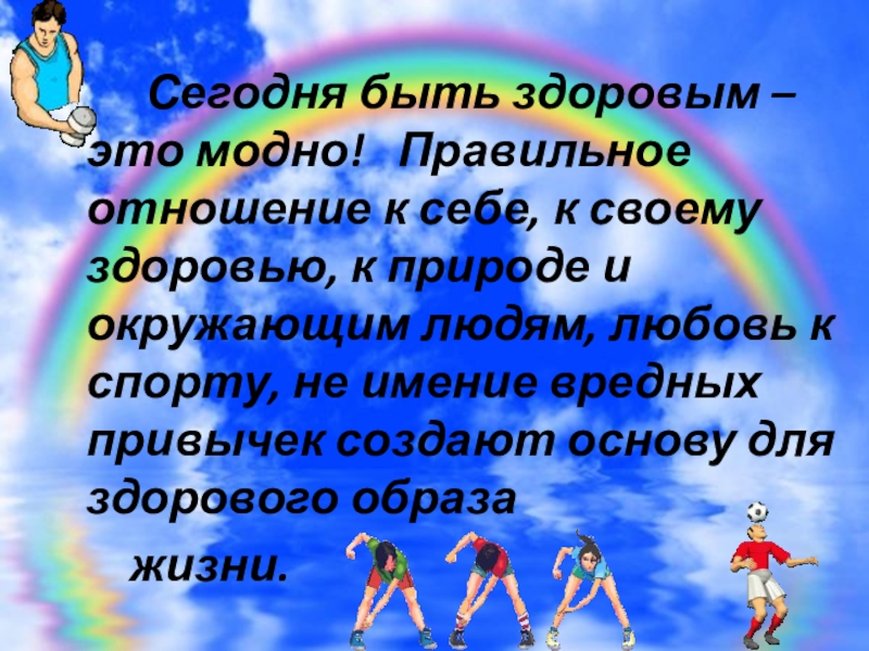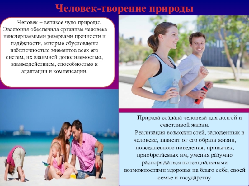 Реализация возможностей, заложенных в человеке, зависит от его образа жизни, повседневного поведения, привычек, приобретаемых им, умения разумно распоряжаться потенциальными возможностями здоровья на благо себе, своей семье и государству.