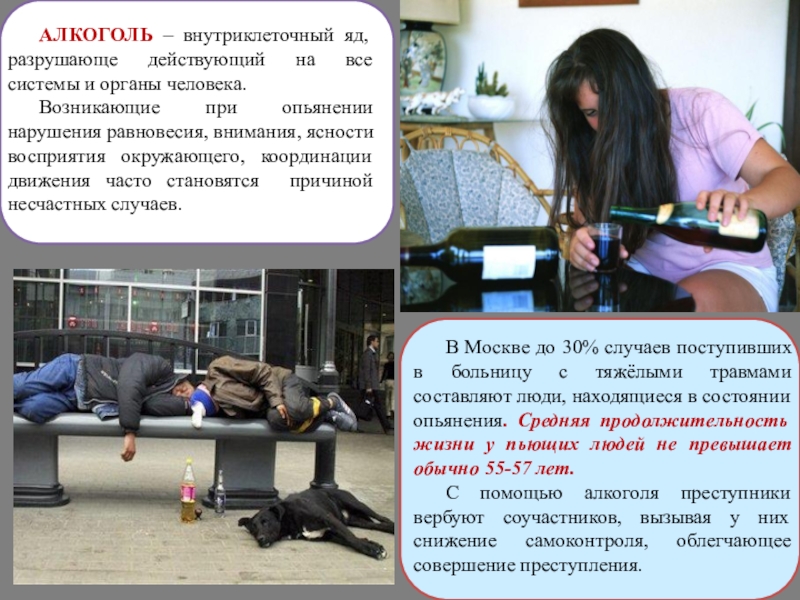 В Москве до 30% случаев поступивших в больницу с тяжёлыми травмами составляют люди, находящиеся в состоянии опьянения. Средняя продолжительность жизни у пьющих людей не превышает обычно 55-57 лет.