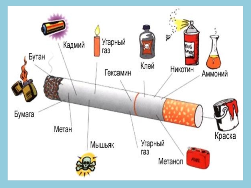 Кроме никотина, табачный дым содержит: угарный газ, синильную кислоту, сероводород, углекислоту, аммиак, эфирные масла, концентрат из жидких и твёрдых продуктов горения и сухой перегонки табака, называемого табачным дёгтем.