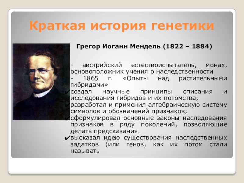 высказал идею существования наследственных задатков (или генов, как их потом стали называть