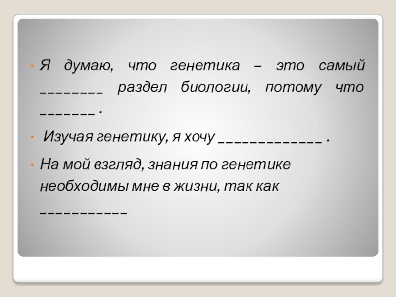 Слайд 27Я думаю, что генетика – это самый ________ раздел биологии, потому