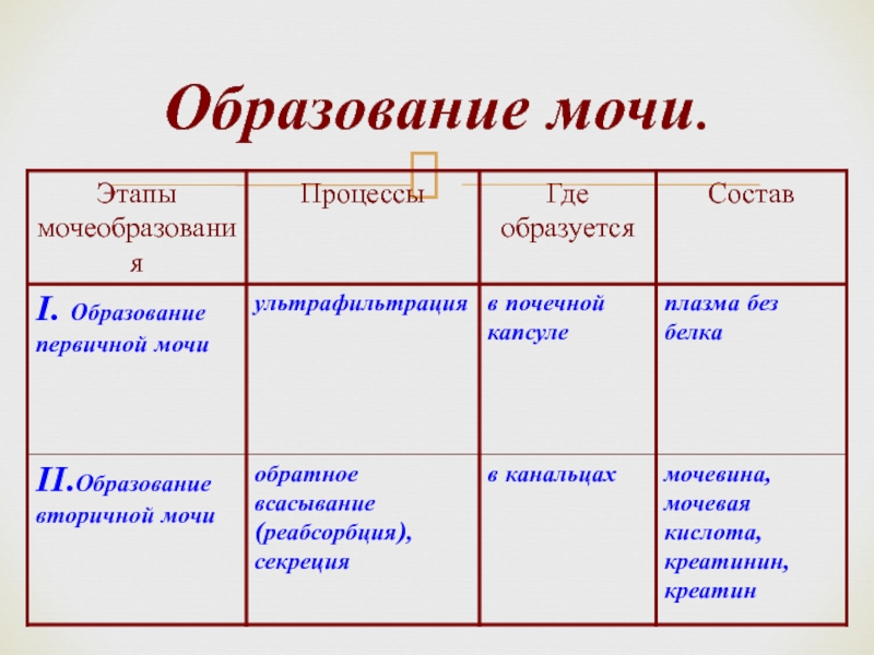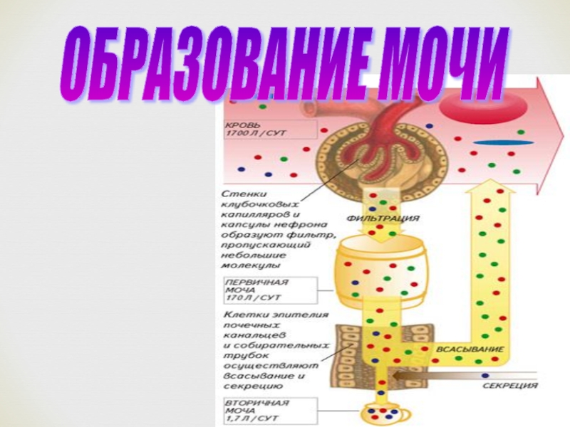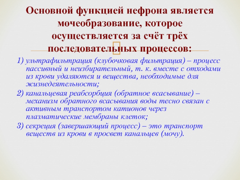 Основной функцией нефрона является мочеобразование, которое осуществляется за счёт трёх последовательных процессов:
