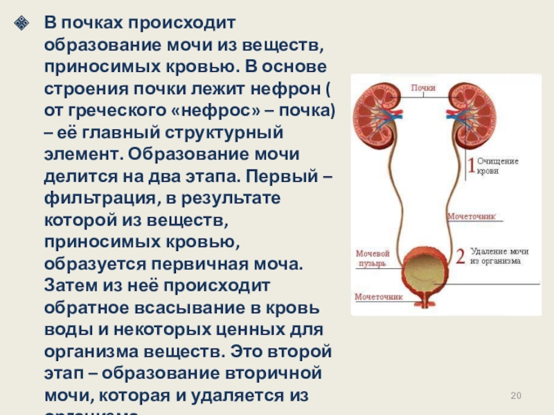 Слайд 20В почках происходит образование мочи из веществ, приносимых кровью. В основе