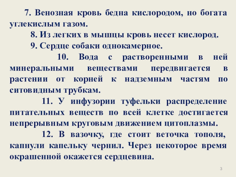 Слайд 3 7. Венозная кровь бедна кислородом, но богата углекислым газом.