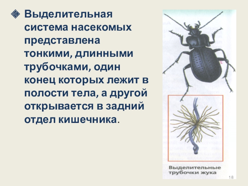 Слайд 18Выделительная система насекомых представлена тонкими, длинными трубочками, один конец которых лежит