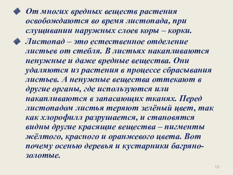 Слайд 12От многих вредных веществ растения освобождаются во время листопада, при слущивании