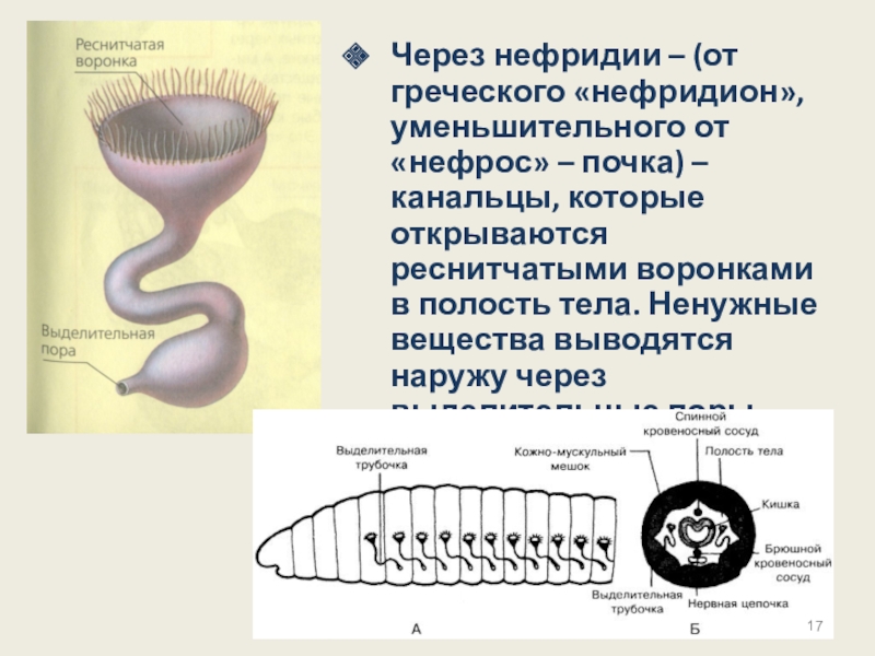 Слайд 17Через нефридии – (от греческого «нефридион», уменьшительного от «нефрос» – почка)