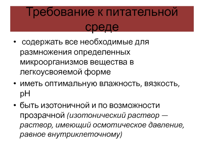 Требование к питательной среде содержать все необходимые для размножения определенных микроорганизмов вещества в легкоусвояемой формеиметь оптимальную влажность,