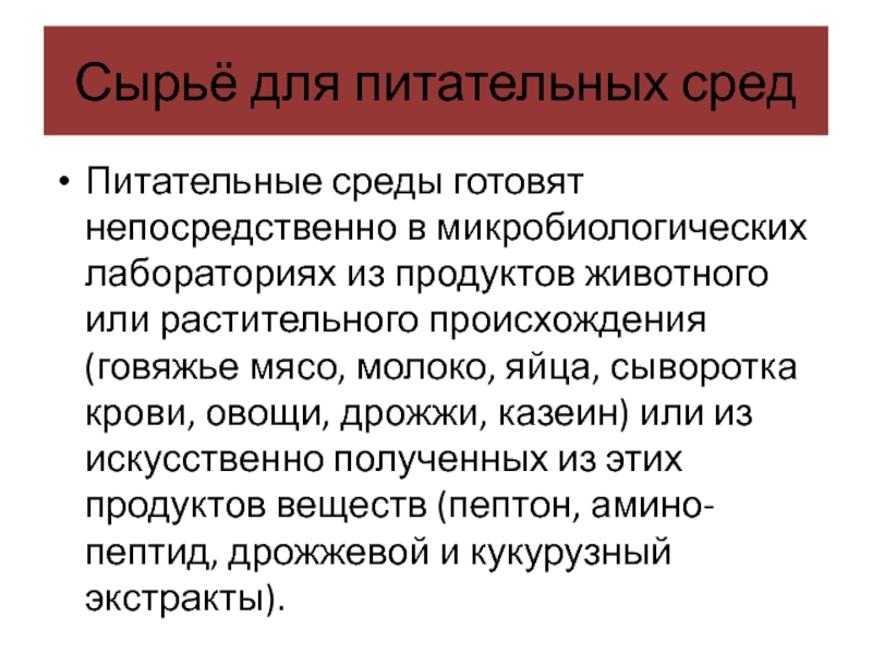 Сырьё для питательных средПитательные среды готовят непосредственно в микробиологических лабораториях из продуктов животного или растительного происхождения (говяжье