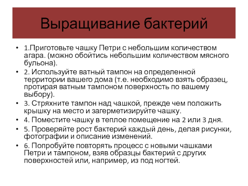Выращивание бактерий1.Приготовьте чашку Петри с небольшим количеством агара. (можно обойтись небольшим количеством мясного бульона). 2. Используйте ватный