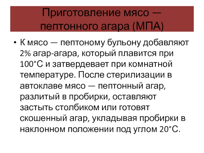Приготовление мясо — пептонного агара (МПА)К мясо — пептоному бульону добавляют 2% агар-агара, который плавится при 100°С