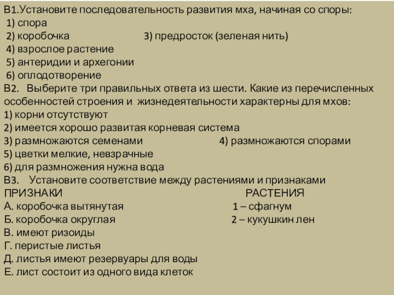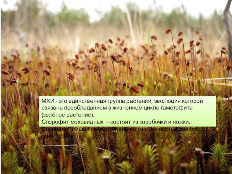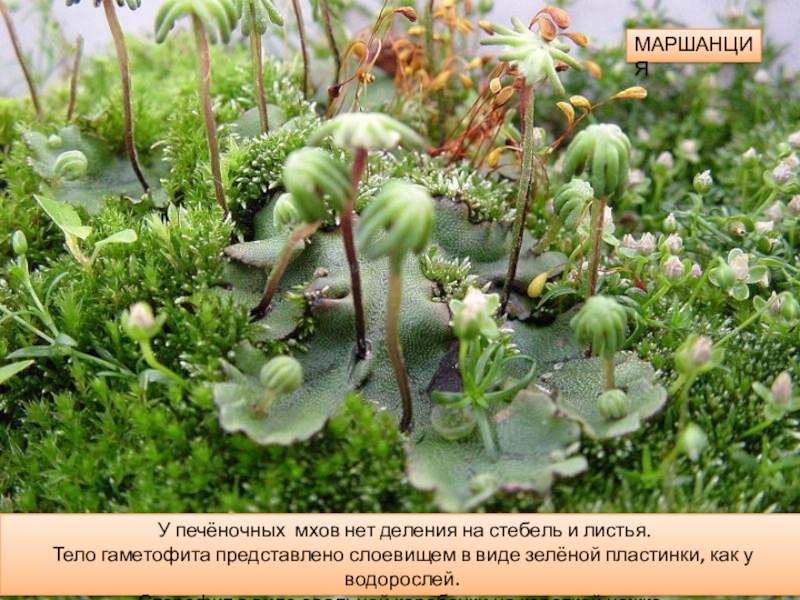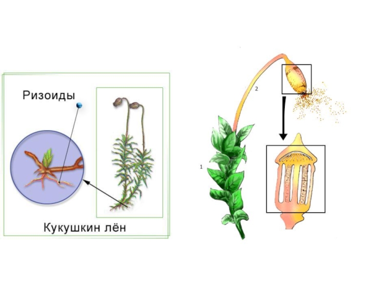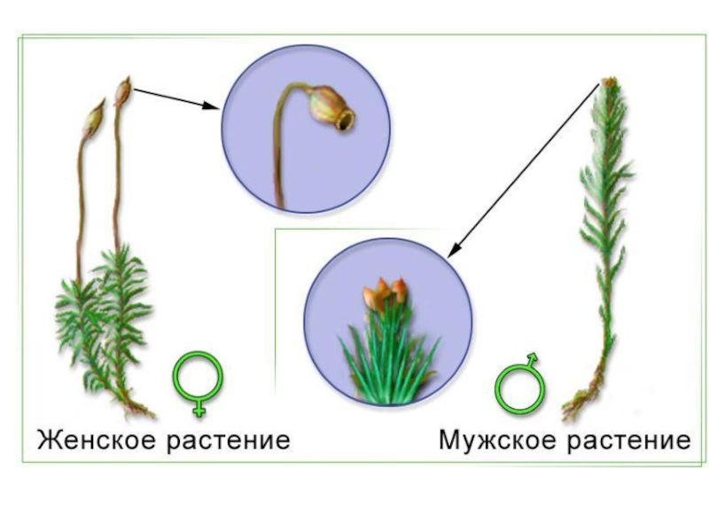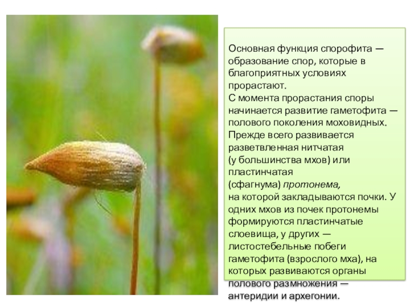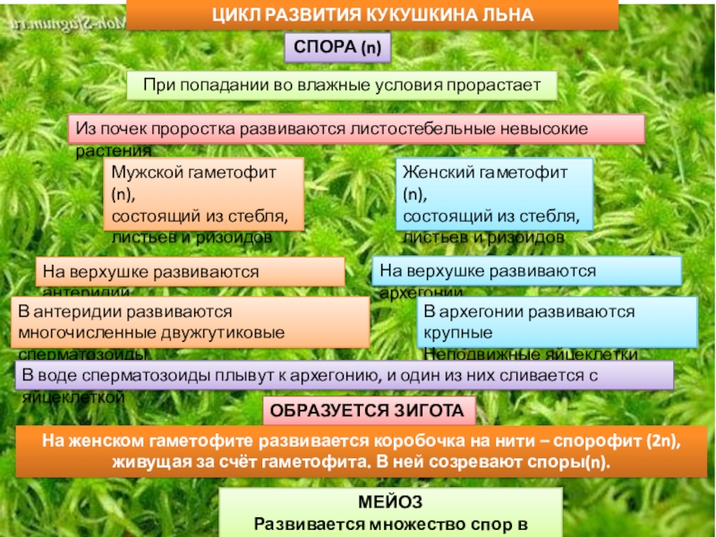 На женском гаметофите развивается коробочка на нити – спорофит (2n), живущая за счёт гаметофита. В ней созревают споры(n).