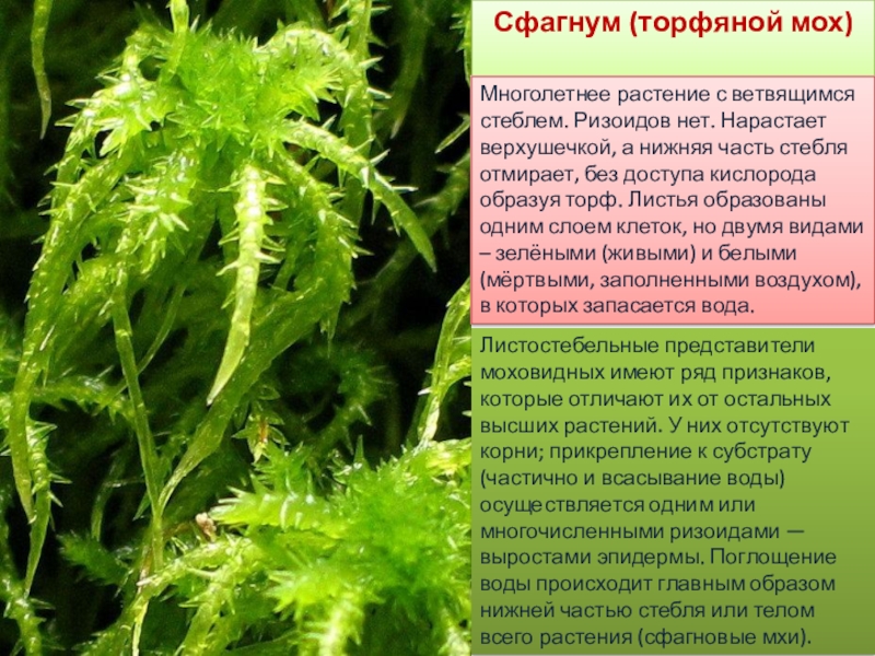 отмирает, без доступа кислорода образуя торф. Листья образованы одним слоем клеток, но двумя видами – зелёными (живыми) и белыми (мёртвыми, заполненными воздухом), в которых запасается вода.