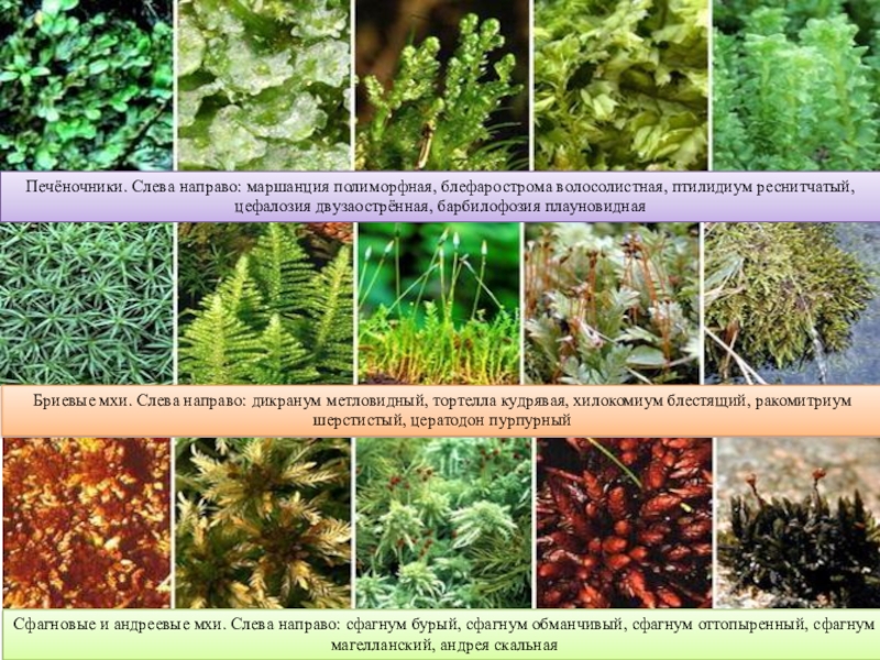 Сфагновые и андреевые мхи. Слева направо: сфагнум бурый, сфагнум обманчивый, сфагнум оттопыренный, сфагнум магелланский, андрея скальная