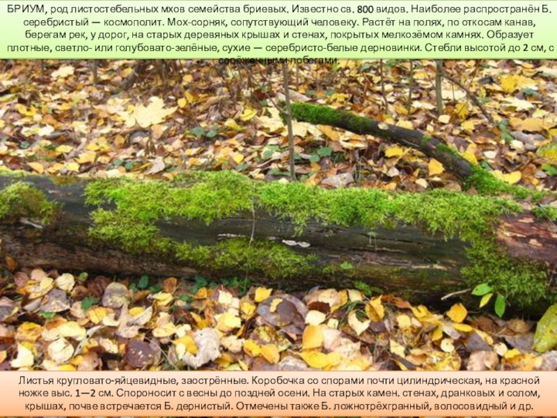 Листья кругловато-яйцевидные, заострённые. Коробочка со спорами почти цилиндрическая, на красной ножке выс. 1—2 см. Спороносит с весны до поздней осени. На старых камен. стенах, дранковых и солом, крышах, почве встречается Б. дернистый. Отмечены также Б. ложнотрёхгранный, волосовидный и др.