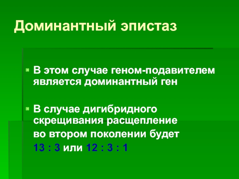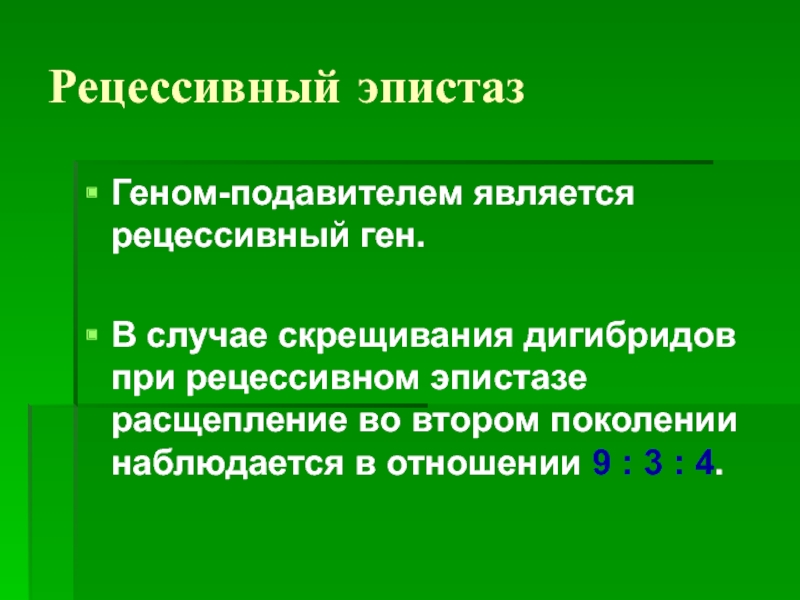 эпистазе расщепление во втором поколении наблюдается в отношении 9 : 3 : 4.