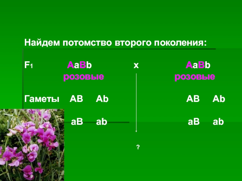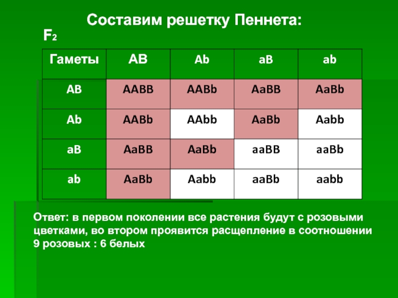только при наличии двух доминантных генов А и В. Если в генотипе имеется только один доминантный ген, то окраска не развивается. Какое потомство F1 и F2 получится от скрещивания растений с генотипами AAbb и aaBB?
