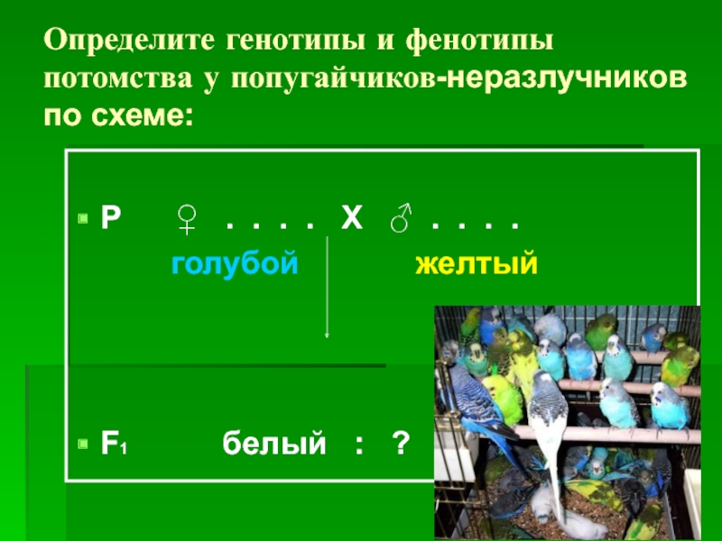 Слайд 14Определите генотипы и фенотипы потомства у попугайчиков-неразлучников по схеме: