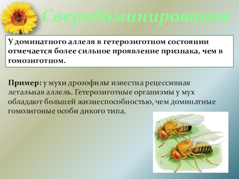 Пример: у мухи дрозофилы известна рецессивная летальная аллель. Гетерозиготные организмы у мух обладают большей жизнеспособностью, чем доминатные гомозигоные особи дикого типа.