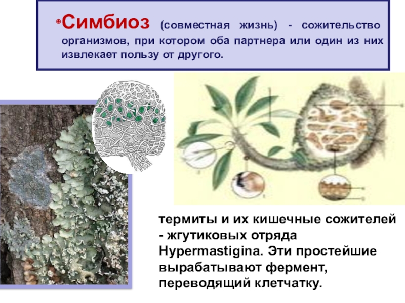 термиты и их кишечные сожителей - жгутиковых отряда Hypermastigina. Эти простейшие вырабатывают фермент, переводящий клетчатку.