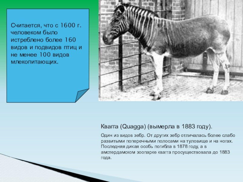 других зебр отличалась более слабо развитыми поперечными полосами на туловище и на ногах. Последняя дикая особь погибла в 1878 году, а в амстердамском зоопарке квагга просуществовала до 1883 года.