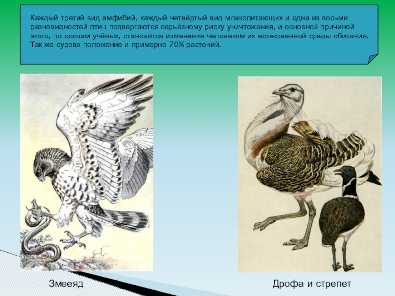 За последние 2 тыс. лет человек уничтожил четверть всех видов птиц, 11% остальных – на грани выживания. Вымирание угрожает также 18% всех видов млекопитающих, 5% рыб, 8% видов растений.