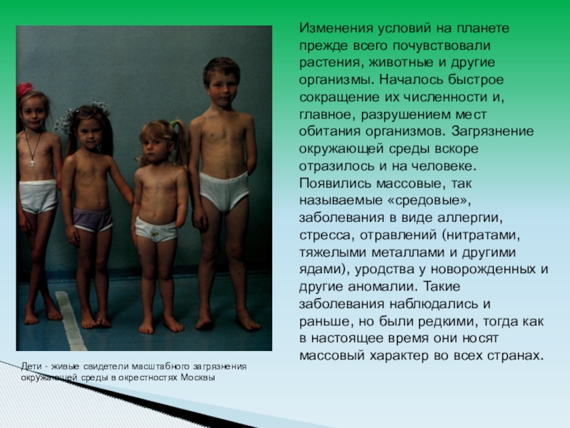 организмы. Началось быстрое сокращение их численности и, главное, разрушением мест обитания организмов. Загрязнение окружающей среды вскоре отразилось и на человеке. Появились массовые, так называемые «средовые», заболевания в виде аллергии, стресса, отравлений (нитратами, тяжелыми металлами и другими ядами), уродства у новорожденных и другие аномалии. Такие заболевания наблюдались и раньше, но были редкими, тогда как в настоящее время они носят массовый характер во всех странах.