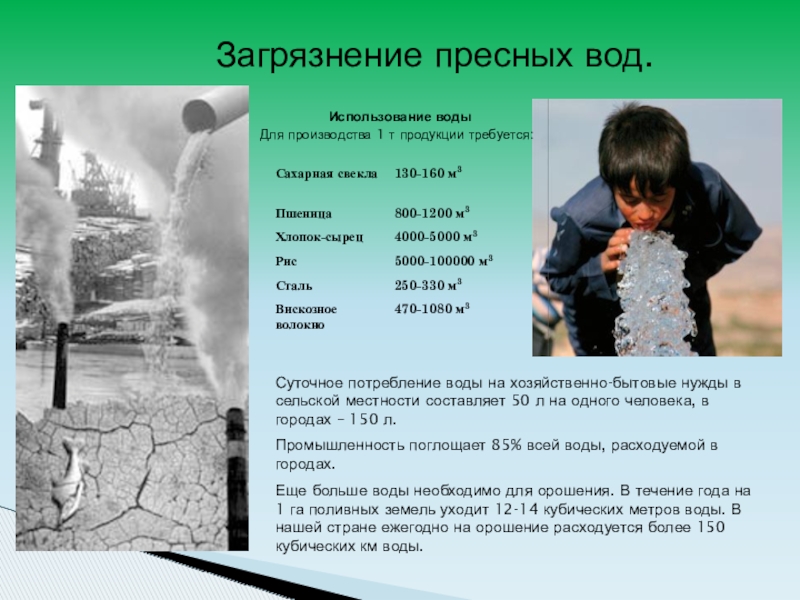 Население индустриально развитых стран тратит на пищевые и санитарные нужды от 150 до 400 л воды в сутки на человека.