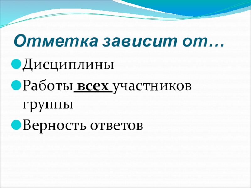 Отметка зависит от…ДисциплиныРаботы всех участников группыВерность ответов