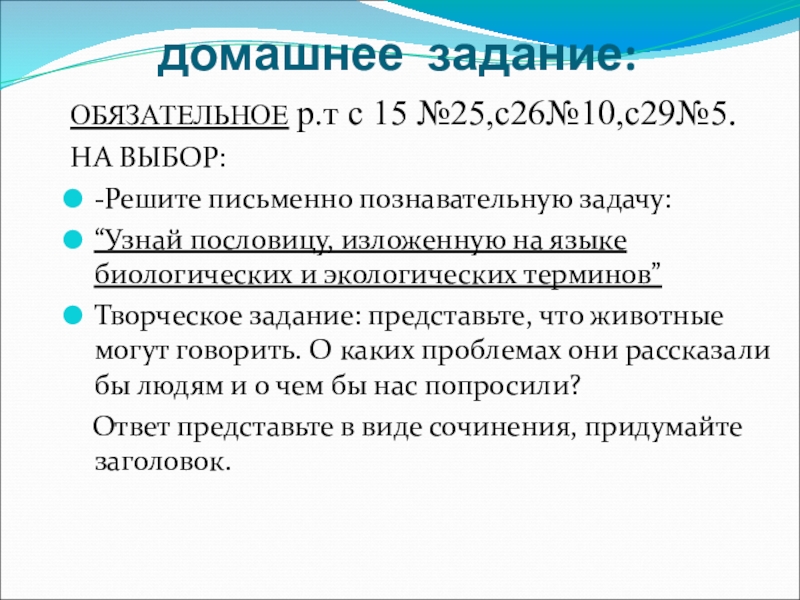 домашнее задание:ОБЯЗАТЕЛЬНОЕ р.т с 15 №25,с26№10,с29№5.НА ВЫБОР:-Решите письменно познавательную задачу: “Узнай пословицу, изложенную на языке биологических и