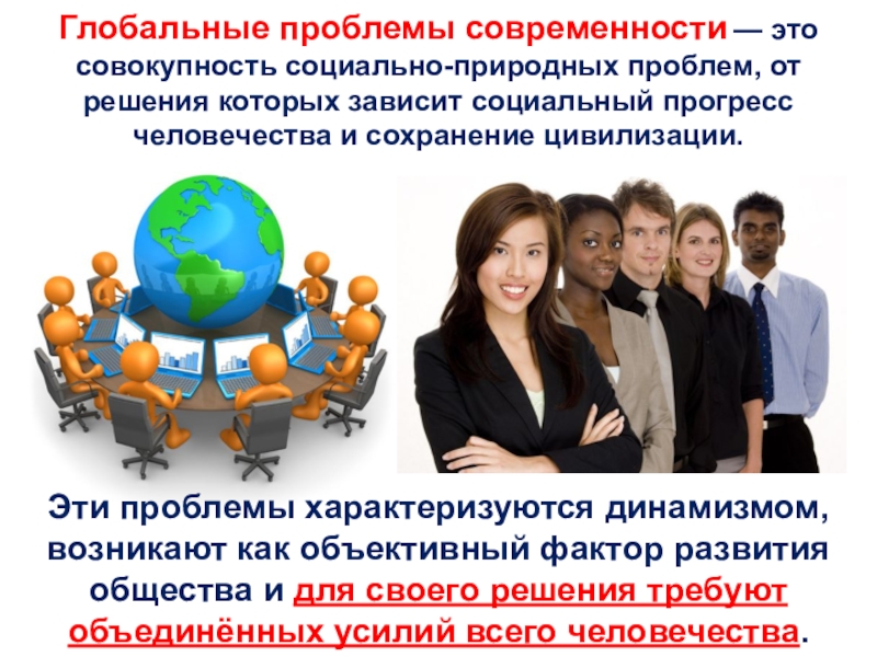 Эти проблемы характеризуются динамизмом, возникают как объективный фактор развития общества и для своего решения требуют объединённых усилий всего человечества.