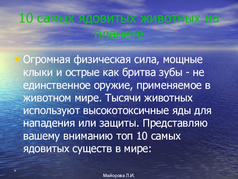 и острые как бритва зубы - не единственное оружие, применяемое в животном мире. Тысячи животных используют высокотоксичные яды для нападения или защиты. Представляю вашему вниманию топ 10 самых ядовитых существ в мире: