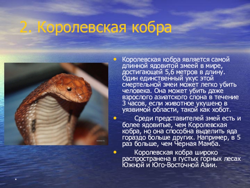 в мире, достигающей 5,6 метров в длину. Один единственный укус этой смертельной змеи может легко убить человека. Она может убить даже взрослого азиатского слона в течение 3 часов, если животное укушено в уязвимой области, такой как хобот.