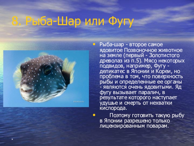 на земле (первый - Золотистого древолаз из п.5). Мясо некоторых подвидов, например, Фугу - деликатес в Японии и Кореи, но проблема в том, что поверхность рыбы и определенные ее органы - являются очень ядовитыми. Яд фугу вызывает паралич, в результате которого наступает удушье и смерть от нехватки кислорода.