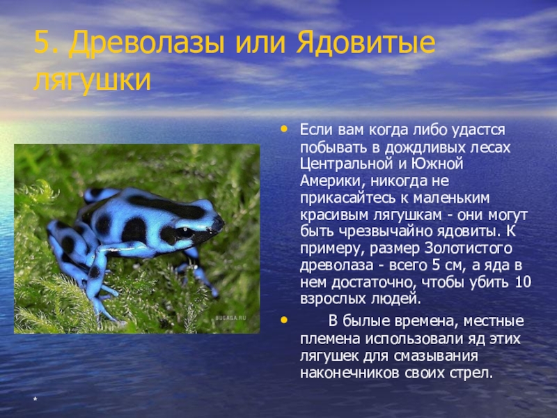 в дождливых лесах Центральной и Южной Америки, никогда не прикасайтесь к маленьким красивым лягушкам - они могут быть чрезвычайно ядовиты. К примеру, размер Золотистого древолаза - всего 5 см, а яда в нем достаточно, чтобы убить 10 взрослых людей.