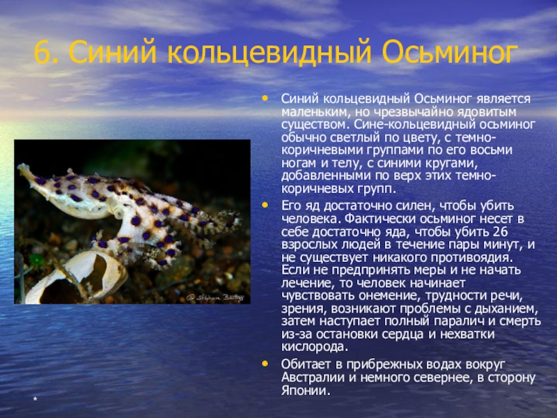 ядовитым существом. Сине-кольцевидный осьминог обычно светлый по цвету, с темно-коричневыми группами по его восьми ногам и телу, с синими кругами, добавленными по верх этих темно-коричневых групп.
