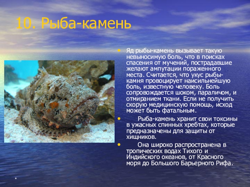 спасения от мучений, пострадавшие желают ампутации пораженного места. Считается, что укус рыбы-камня провоцирует наисильнейшую боль, известную человеку. Боль сопровождается шоком, параличом, и отмиранием ткани. Если не получить скорую медицинскую помощь, исход может быть фатальным.