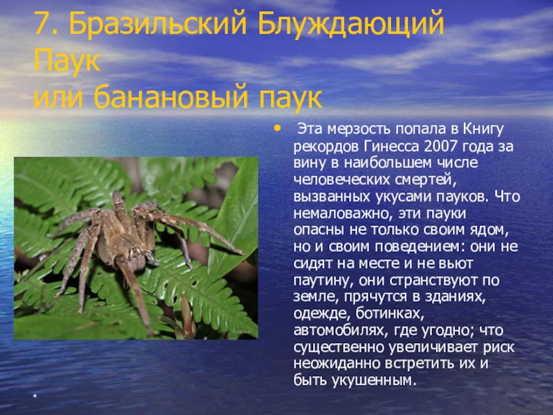 Книгу рекордов Гинесса 2007 года за вину в наибольшем числе человеческих смертей, вызванных укусами пауков. Что немаловажно, эти пауки опасны не только своим ядом, но и своим поведением: они не сидят на месте и не вьют паутину, они странствуют по земле, прячутся в зданиях, одежде, ботинках, автомобилях, где угодно; что существенно увеличивает риск неожиданно встретить их и быть укушенным.
