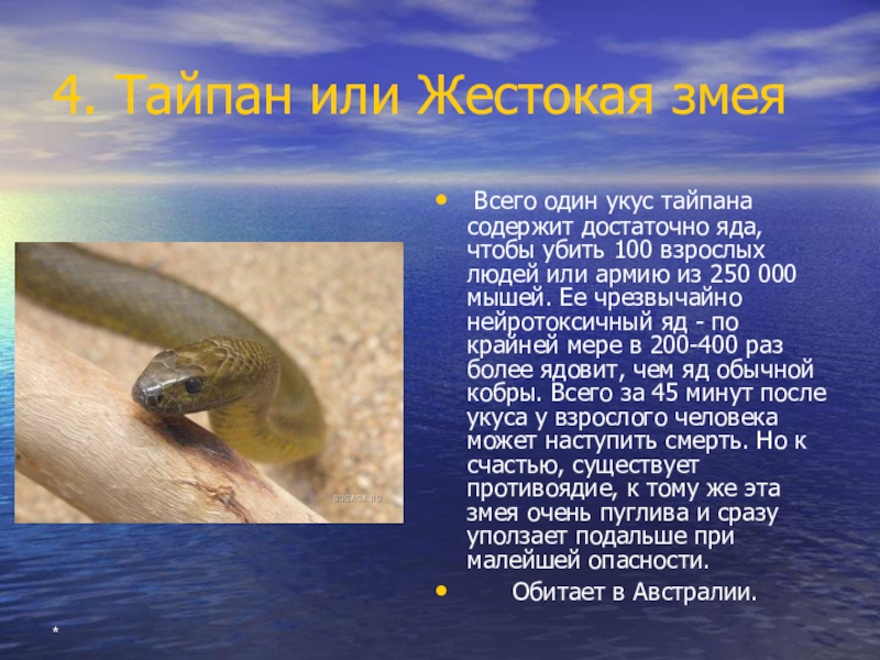достаточно яда, чтобы убить 100 взрослых людей или армию из 250 000 мышей. Ее чрезвычайно нейротоксичный яд - по крайней мере в 200-400 раз более ядовит, чем яд обычной кобры. Всего за 45 минут после укуса у взрослого человека может наступить смерть. Но к счастью, существует противоядие, к тому же эта змея очень пуглива и сразу уползает подальше при малейшей опасности.