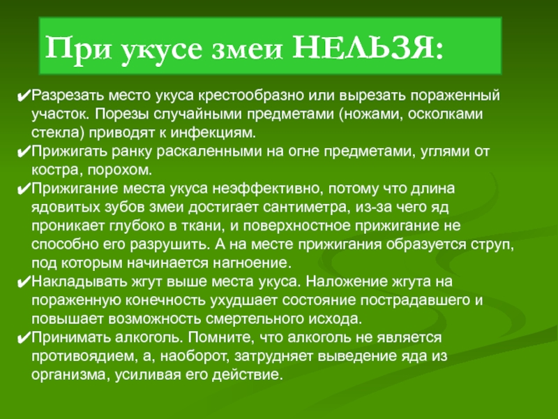 При укусе змеи НЕЛЬЗЯ: