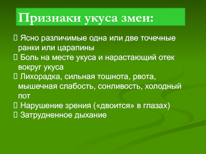 Признаки укуса змеи: