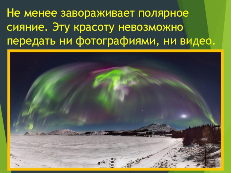 Слайд 8Не менее завораживает полярное сияние. Эту красоту невозможно передать ни фотографиями,