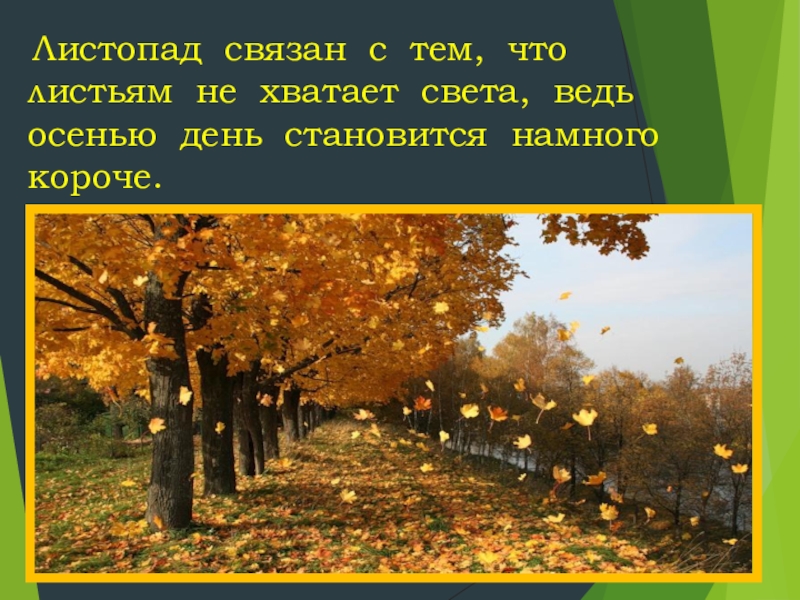 Листопад связан с тем, что листьям не хватает света, ведь осенью день становится намного короче.