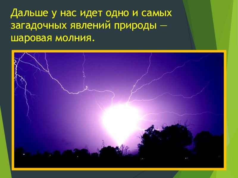 Дальше у нас идет одно и самых загадочных явлений природы — шаровая молния.