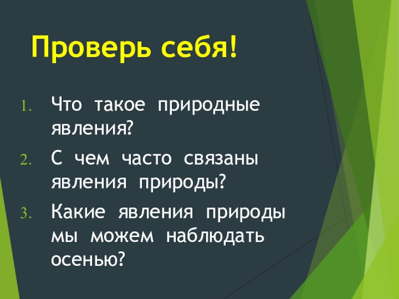 Проверь себя!Что такое природные явления?С чем часто связаны явления природы?Какие явления природы мы можем наблюдать осенью?
