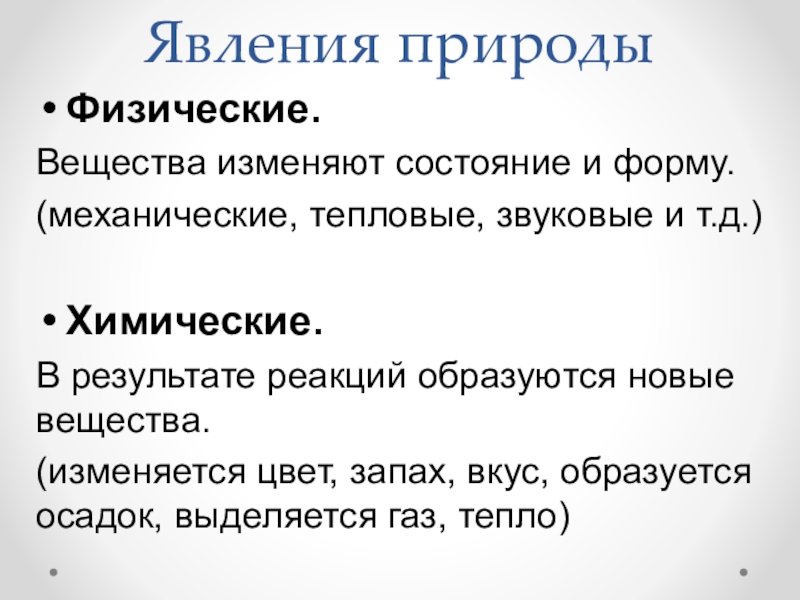 Явления природыФизические. Вещества изменяют состояние и форму.(механические, тепловые, звуковые и т.д.)Химические.В результате реакций образуются новые вещества.(изменяется цвет,